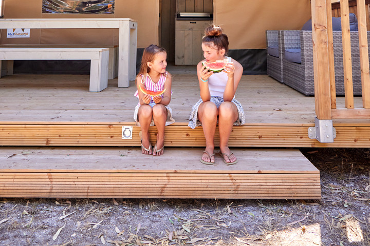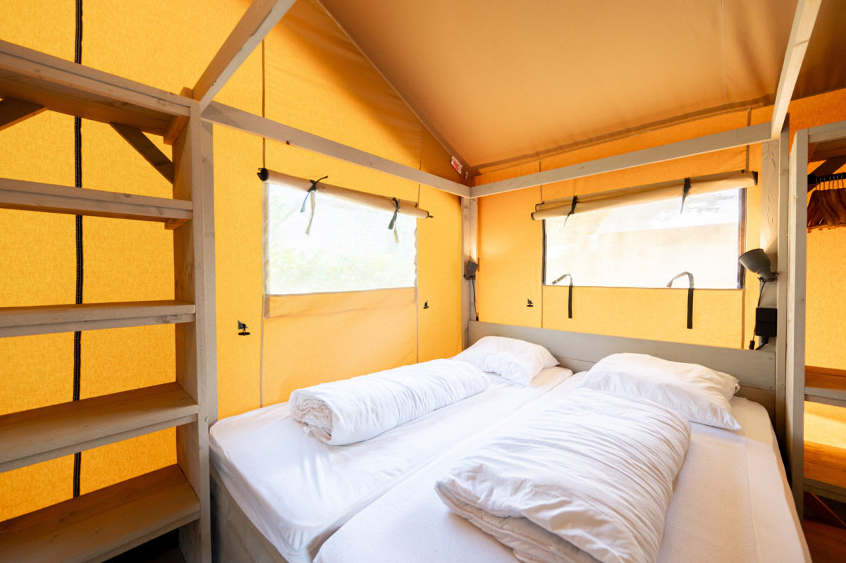 La Villatent Nomad, la nostra classica tenda da safari, è completamente attrezzata. Questa tenda offre una lussuosa esperienza di glamping per un massimo di sei persone. La tenda dispone di una cucina completamente attrezzata. In alcune tende si trova un soggiorno con un grande tavolo da pranzo, in altre un divano ad angolo. La relativa variante viene sempre indicata al momento della prenotazione. Un lusso extra è il bagno completo con doccia, wc e lavabo. Villatent è nota per i suoi letti confortevoli. Il Nomad dispone di due camere da letto, con un letto matrimoniale e due letti a castello lunghi due metri, comodi per adulti e bambini. Grazie allo spazio interno di 35 m2 e alla spaziosa terrazza con tavolo e sedie a sdraio, questa tenda è la base perfetta per ricordi di vacanza indimenticabili.