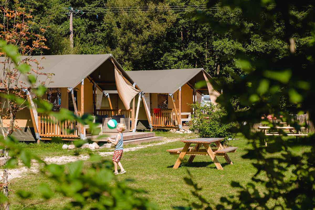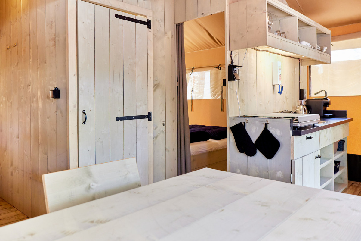 Grazie al funzionale divano letto nel soggiorno, questa tenda può essere ampliata per ospitare cinque persone. Ciò rende questa Villatent flessibile e ideale per le famiglie più numerose. La prima camera da letto ha un letto matrimoniale, mentre la camera adiacente è dotata di letti a castello.