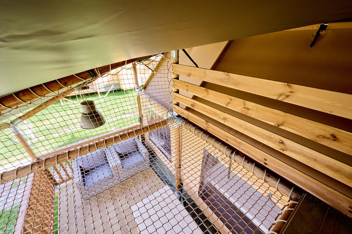 Il Villatent Ranger è completamente attrezzato per sei persone. Si tratta di un Villatent super lussuoso con un tocco unico, ovvero il piano superiore. La giocosa rete sospesa e la mini tenda sopra la terrazza garantiscono un'esperienza glamping speciale. I bambini sono entusiasti! Il Villatent Ranger offre molto spazio. Nella zona giorno troverete una cucina completamente attrezzata con lavastoviglie, un grande tavolo da pranzo per 6 persone e un divano per rilassarsi. Il bagno è dotato di WC, ampia cabina doccia e lavabo. Ci sono due camere da letto, una con letto matrimoniale e una con due letti a castello. I letti sono dotati di graziosi materassi lunghi due metri, comodi sia per gli adulti che per i bambini Fuori si può sfruttare al massimo l'ampia terrazza. Qui trovate un grande tavolo e due rilassanti poltrone.